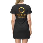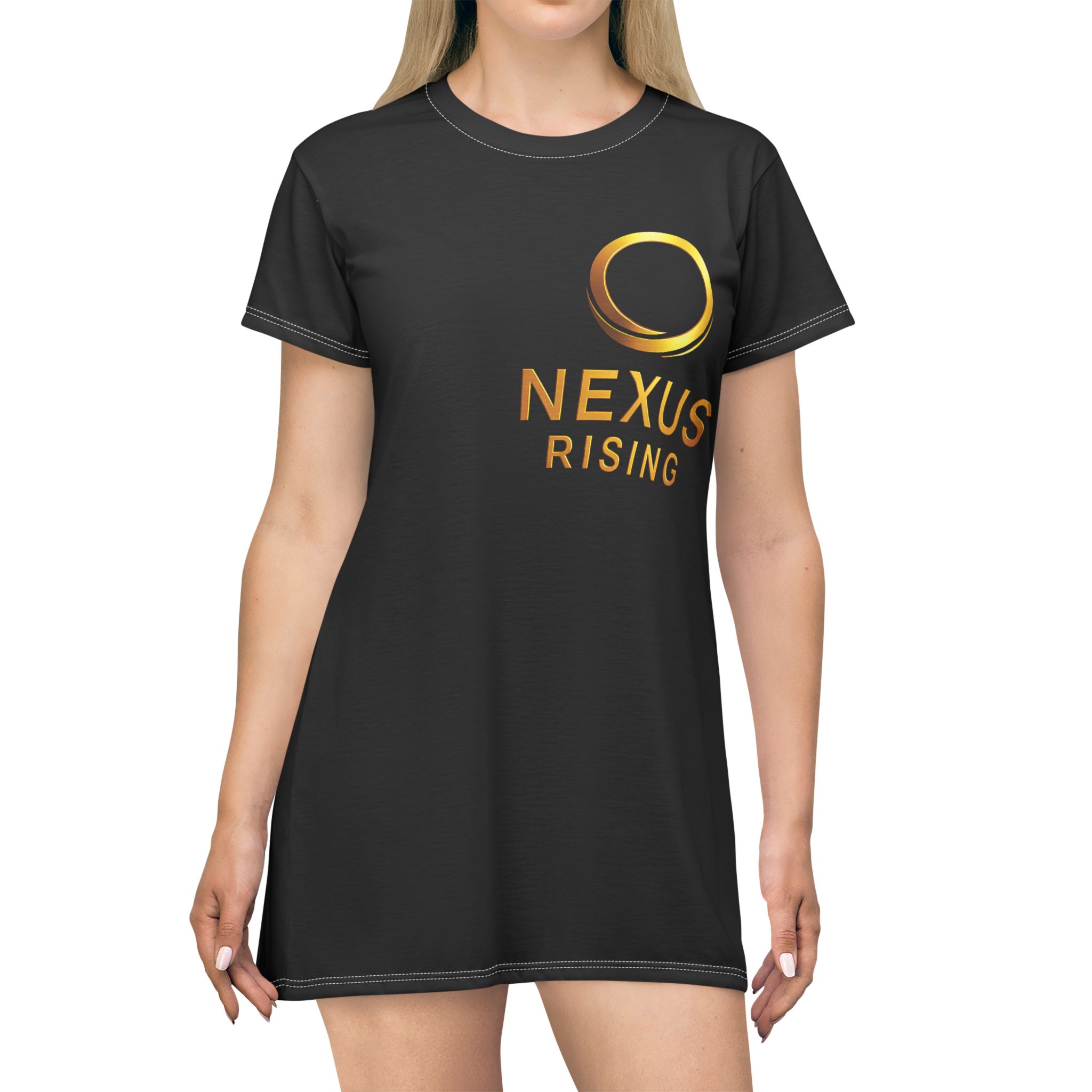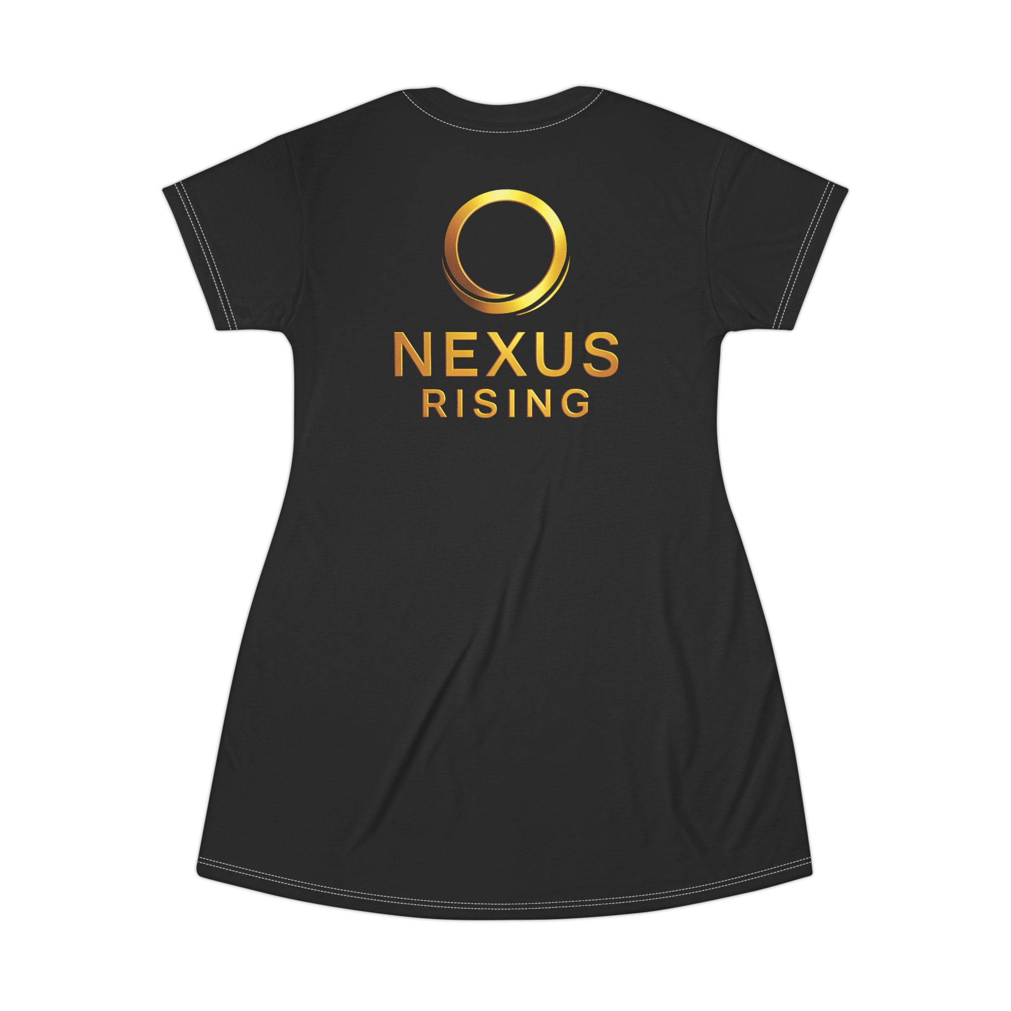 A sleek, all-over print dress that reads like wearable branding — lightweight and shaped for easy movement. The deep black background makes the warm gold “NEXUS RISING” emblem pop, creating a streamlined, modern silhouette that feels both confident and understated. Soft stretch from the polyester keeps the dress draping cleanly, while side seams and self-fabric binding maintain structure. Wear it to a meetup, a panel, or a low-key launch party — it sits comfortably through travel and late-night conversations, signaling membership without shouting. The tagless finish and true-to-size fit keep the focus on the graphic and the moment, not on fussing with labels or fit adjustments.